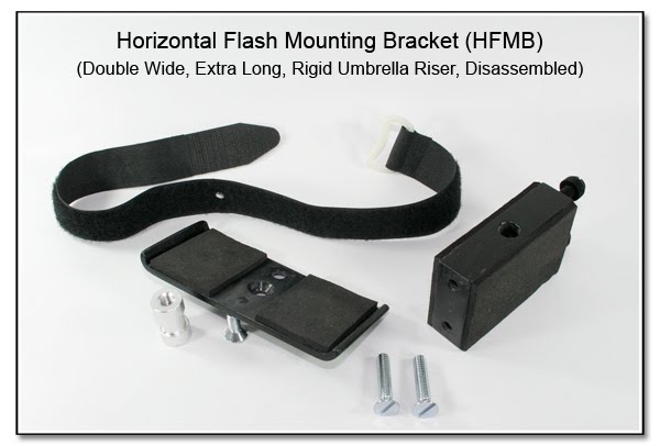 This newest version of the HFMB - Double Wide is both longer (front to back) and wider (side to side) than the normal version PJ1011. The increased dimensions allow for a foam covered Rigid Umbrella Riser that is bolted to the base HFMB, and has a straight through umbrella hole that is centered between and parallel to the centerline of the 2 flash units, as seen in this image. The increased length allows for a greater back and forth adjustment of the flash