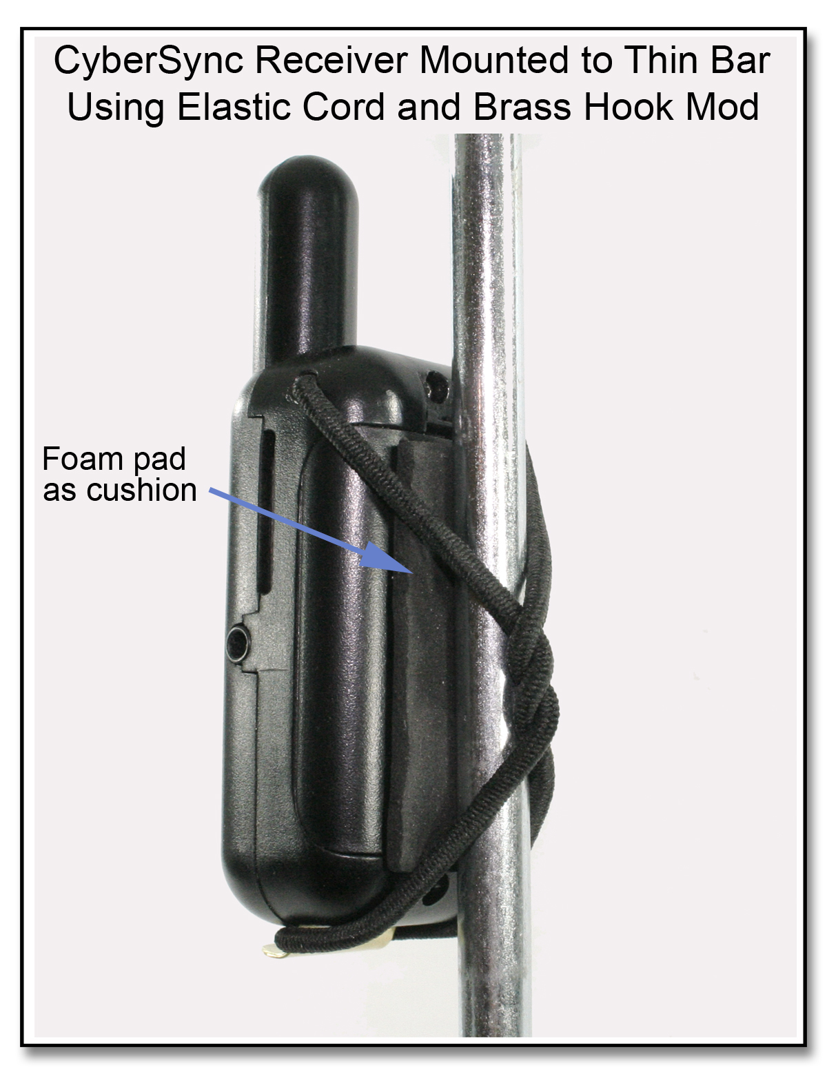 The last in the series of mountings for the CyberSync Receiver is the Elastic Cord & Brass Hook Mod. Instead of a single sided soft nylon Lanyard (just above), a length of heavy round elastic cord is used to either act as a hanging loop, or to secure the CyberSync to just about any object. The elastic is then be secured on the small brass hook embedded into the bottom of the case. Either a section of