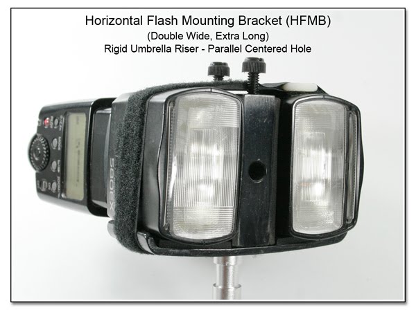 With the HFMB mounted on a spigot, any umbrella holder / angle adapter can be used for mounting to a light stand. Having the Rigid Umbrella Riser allows the placement of an umbrella directly centered between the flash units, as shown by the placement of the 3/8 steel rod (image left).