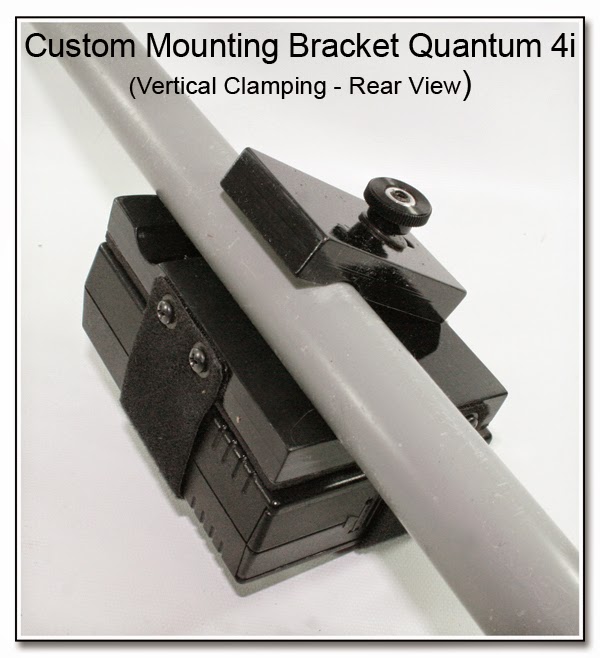 along with the multi-use clamping bracket allow the device to be secured to either a vertical or horizontal tube or plate with just a simple adjustment of the threaded nut and replaceable threaded stud. You can even use a short threaded stud and attach a Super Clamp in place of the existing multi-use clamping bracket. It is just $55 to make this Custom Mounting Bracket as shown. This method of making a custom mounting can be sized for such things as the Quantum Turbo, Vagabond Mini Lithium and other brands of battery packs or for almost anything you can imagine...just ask.