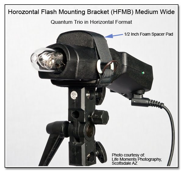 This image, sent in by Peter at Life Moments Photography of Scottsdale, AZ, shows the QFlash Trio mounted in the HFMB (Medium Wide), using the 1/2 inch Foam Spacer Pad both for added support, and to help take up the slack in the Cinch Strap. The metal ring provides an easy attachment point for a safety strap tether.