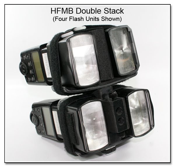 The HFMB Double Wide version can be used to mount 2 flash units into a Chimera speedring as seen in these 2 images (left, and just below). This Chimera speedring shown has an internal opening of 5 7/16 inches (138 mm), and the dual flash setup shown is using the Rigid Umbrella Riser of item PJ1102