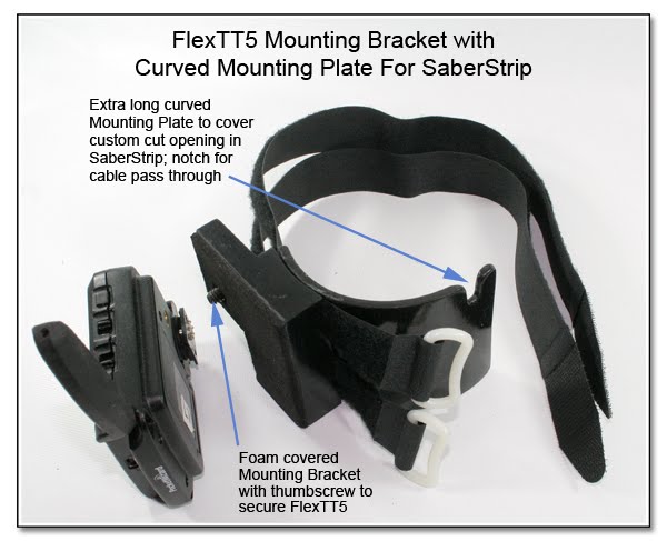 the bottom surface. The larger than needed Curved Mounting Plate shown was made to cover up, or "patch" an opening that was cut (intentionally) into the side of the SaberStrip as an access port. The notch in the Curved Mounting Plate allows the Off Camera Cord to pass into the SaberStrip without making a notch in the bottom plastic base. The flat head screws holding the Curved Mounting Plate to the FlexTT5 Mounting Block (capturing the Cinch Straps) are recessed below the curved surface so as to not scratch the finished surface of the SaberStrip.Costs: The Curved Mounting Bracket, Cinch Straps, FlexTT5 Mounting Block and Thumbscrew assembly is $125. Connecting the FlexTT5 to the flash unit inside the SaberStrip would usually be done using an Off Camera Cord, Canon or Nikon, with either a shortened straight cable, or the existing coiled cable. This cable is then routed down and then up through the base section. If the SaberStrip is sitting on a hard surface, damage to the cord can occur unless a notch is made in the edge of the base section. It is $10 additional for me to cut and file this notch in the edge of the base section.